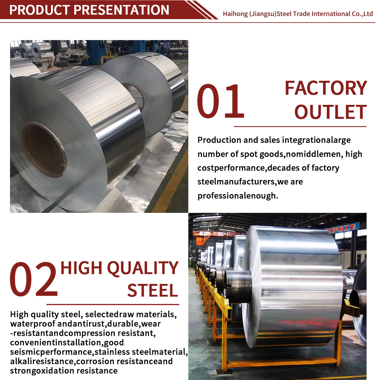 Haihong (Jiangsu) Steel International Trading Co., Ltd. is a comprehensive enterprise integrating production and foreign trade, with a deep commitment to the metal products industry. The company occupies a modern production base of approximately 1,000 mu and has a professional workforce of over 500 employees. Supported by its strong production capabilities and professional service team, the company specializes in a diverse range of metal products, including stainless steel plates, color-coated steel coils, aluminum plates, stainless steel pipes, stainless steel profiles, etc.